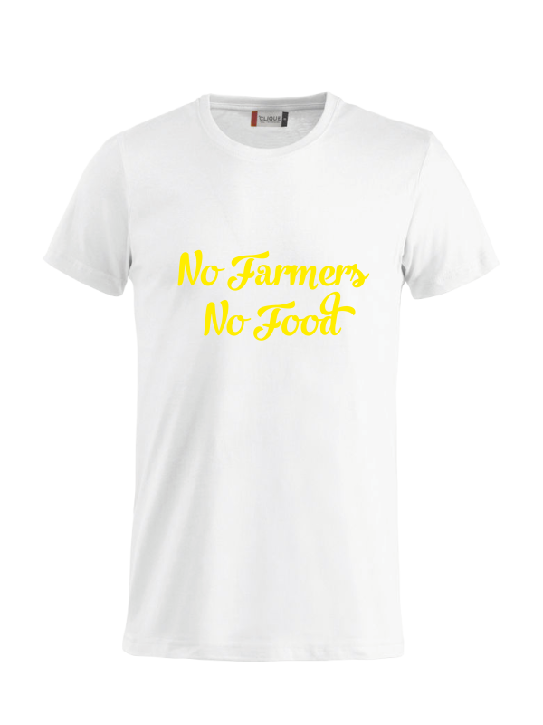 T-Shirt No Farmers No Food Wit met gele tekst